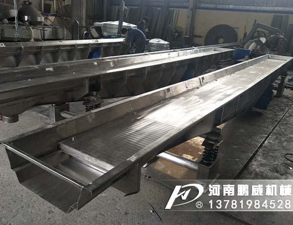 鵬威機械生產的振動輸送機是利用激振器使料槽振動,從而使槽內物料沿一定方向滑行或拋移的連續輸送機械。一般用于水平輸送,生產率小于150t/ h,輸送距離小于80m,傾斜上運時,生產率隨傾角增 大而下降。除激振機構某些零部件外,相對轉動部件很少,結構簡單,可輸送各種粒度的物料,能對灼熱的、易燃易爆的、有毒的、多塵的物料實行封閉輸送,在運送過程中可同時完成篩分、脫水和冷卻等工藝操作。但不宜輸送粘性物料。常用于化工和建材工廠。